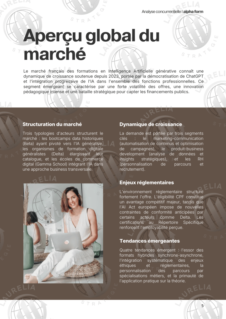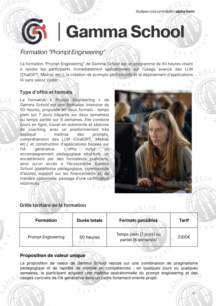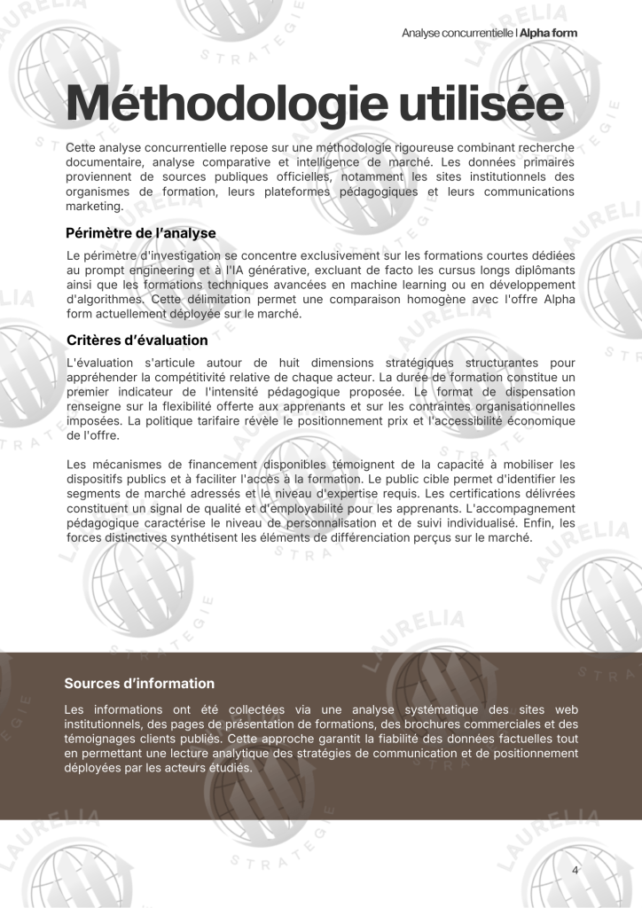 Pour chacun des acteurs étudiés, le rapport décrypte huit dimensions stratégiques : l’offre et son positionnement marché, la grille tarifaire et l’accessibilité économique, les forces et faiblesses identifiées, la stratégie digitale et de communication, le public cible adressé, la proposition de valeur différenciante, l’accompagnement client proposé, ainsi que les éléments de preuve sociale mobilisés.