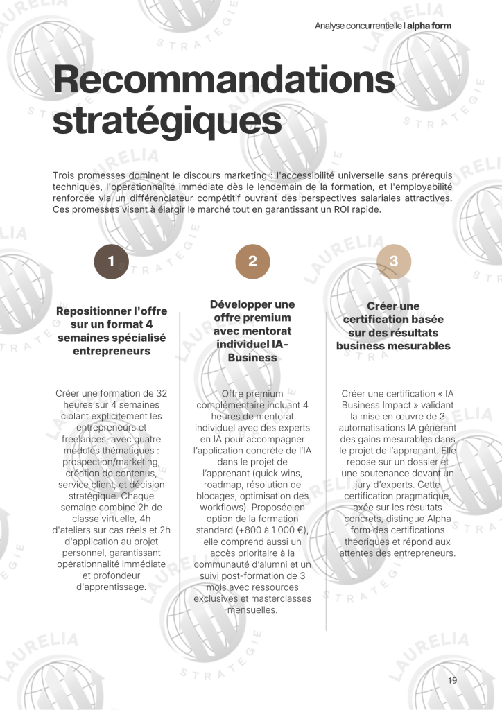 | Opportunités stratégiques identifiées | Gaps de marché et angles de différenciation inexploités |