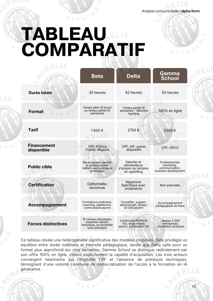 | Analyse détaillée de 3 concurrents | Offre, pricing, forces, faiblesses, stratégie digitale, cible |